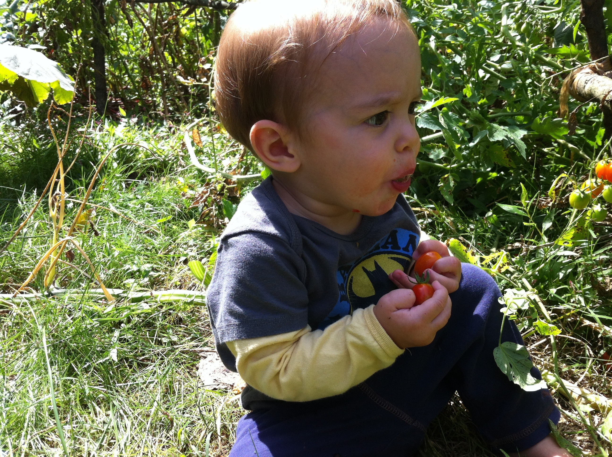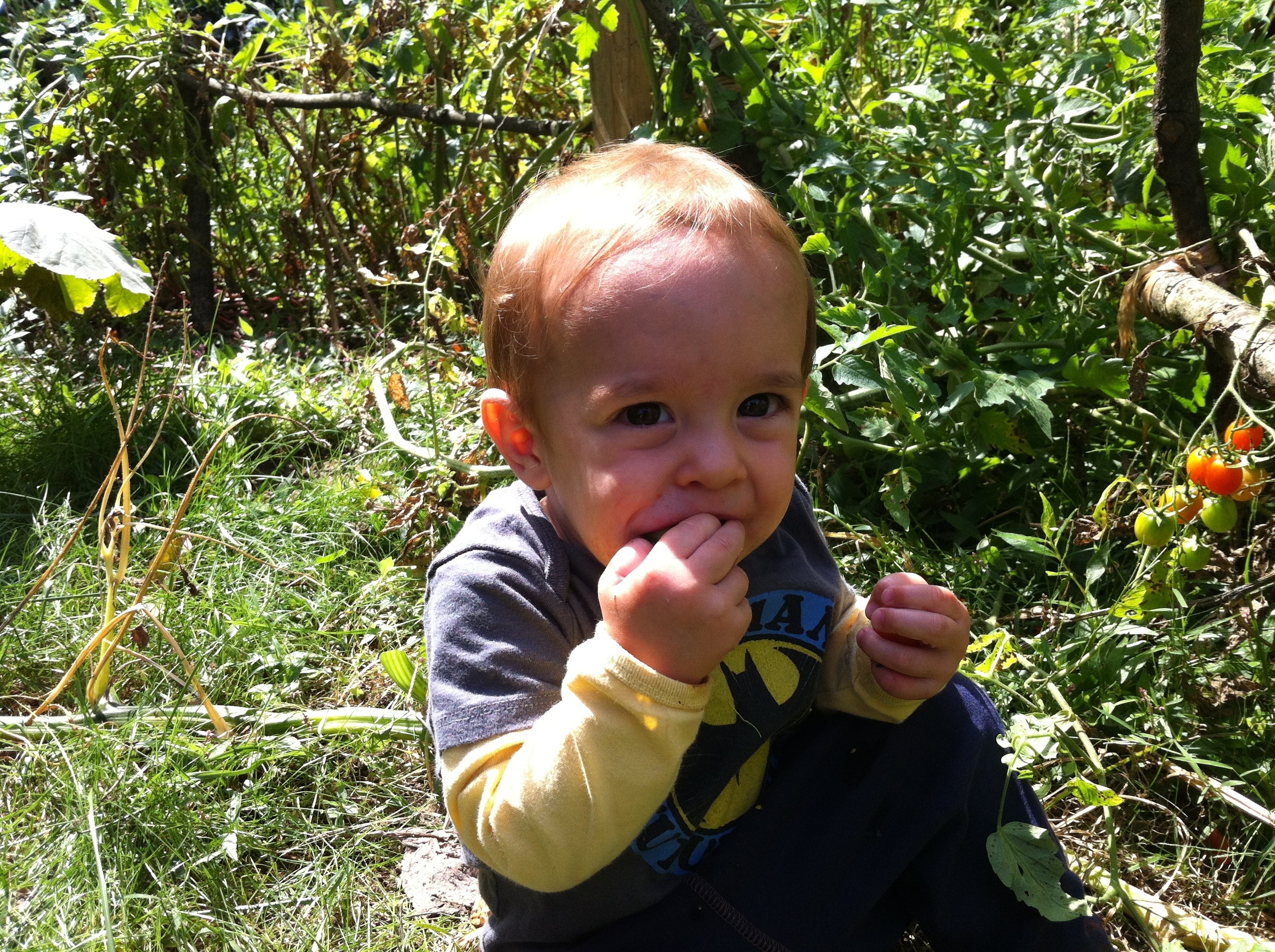 Our insanity garden was an overgrown mess of a trillion tomatoes and squash plants…with some radish and peas and basil thrown in. Papa pruned while Hagan participated by stuffing his face with as many tiny tomatoes he could get his hands on.